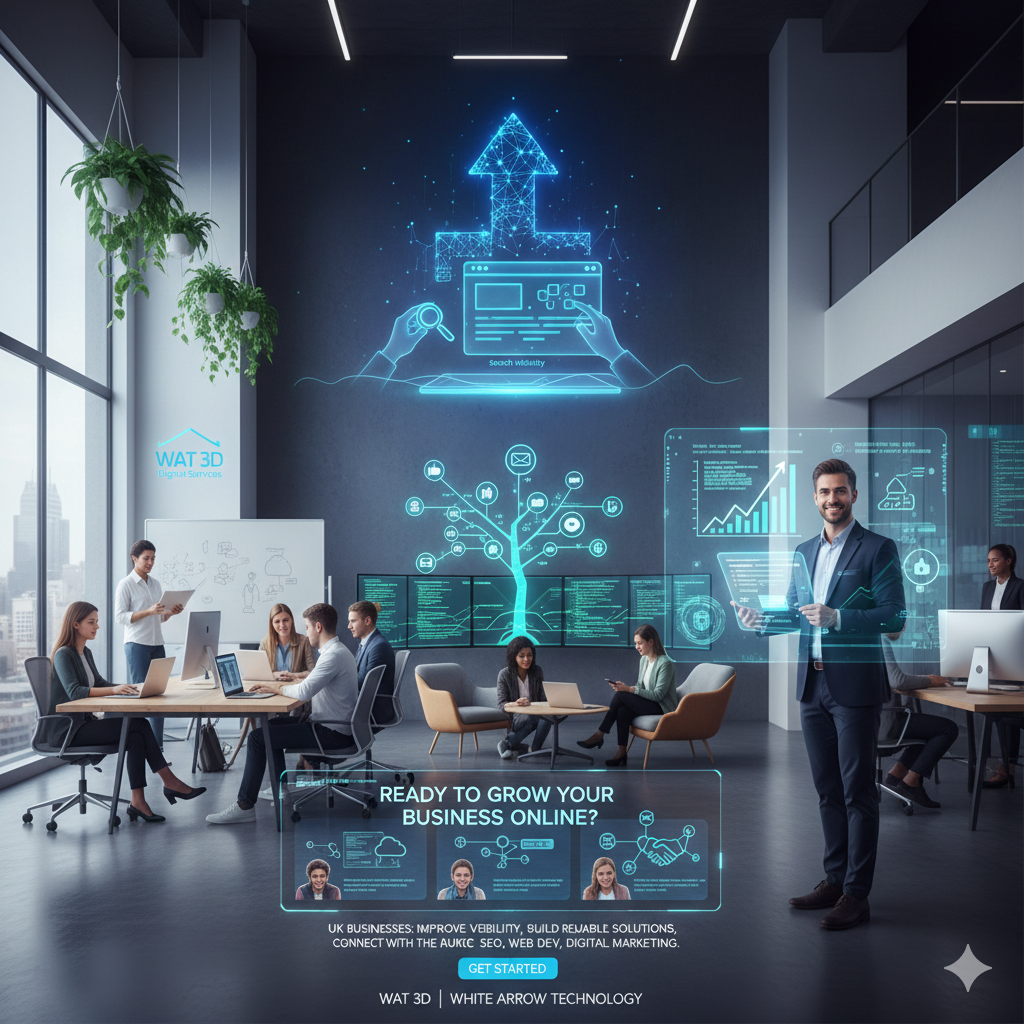 At WAT 3D, we make it easy for businesses across the UK to access professional digital services without unnecessary complexity. As part of White Arrow Technology, we provide structured solutions in SEO, web development, software development, content creation, and digital engagement—all tailored to your business goals.